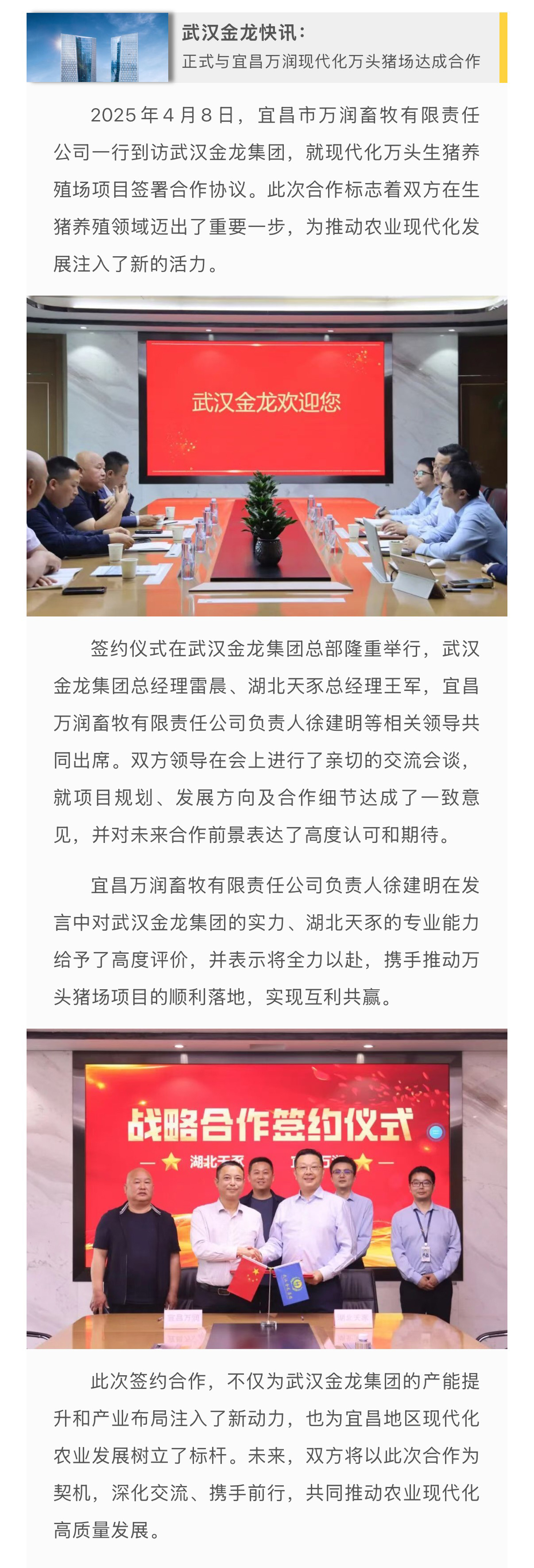 熱烈祝賀武漢金龍集團(tuán)子公司湖北天豕與宜昌萬潤(rùn)現(xiàn)代化萬頭豬場(chǎng)達(dá)成合作!